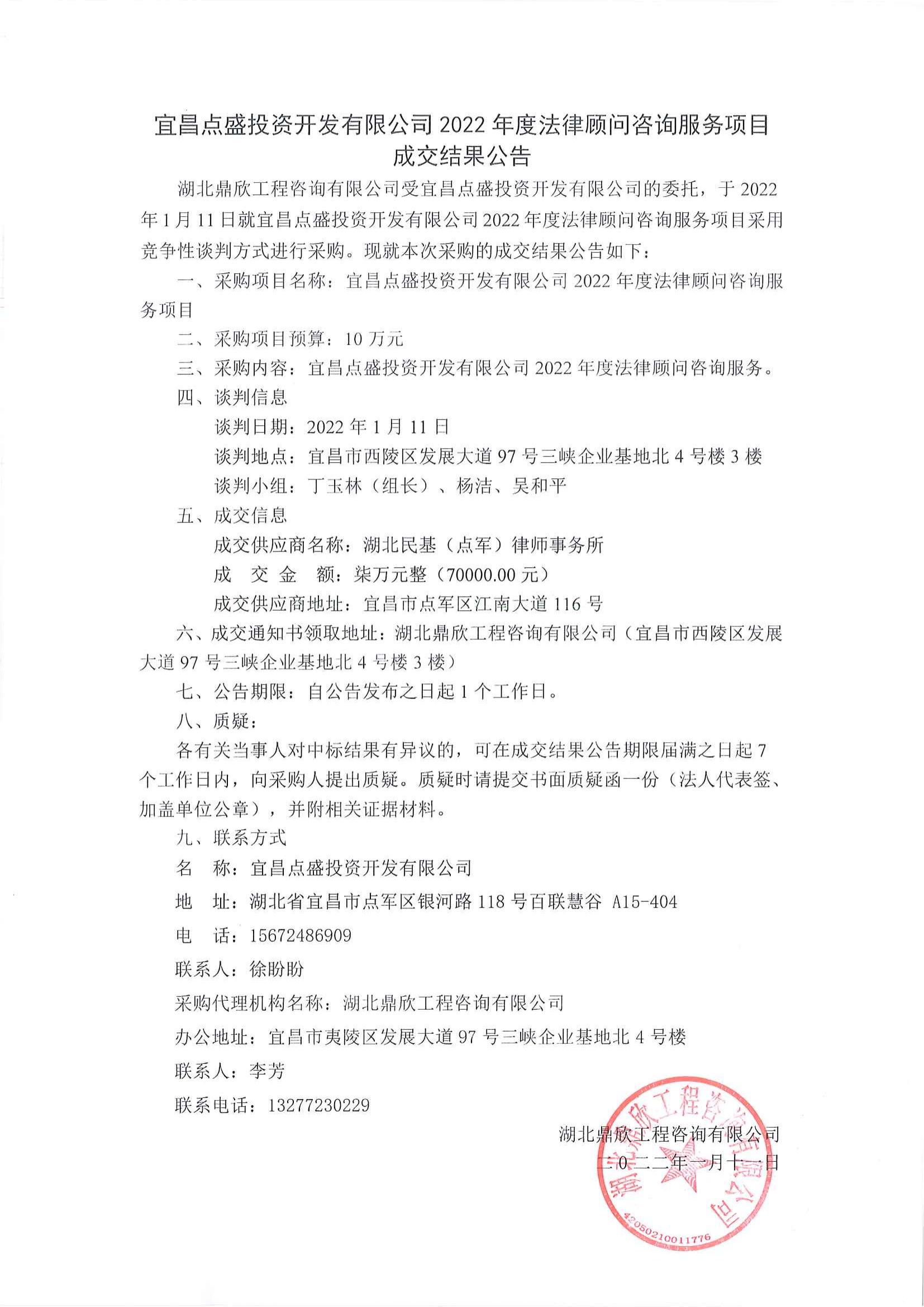 宜昌點(diǎn)盛投資開發(fā)有限公司2022年度法律顧問咨詢服務(wù)項(xiàng)目成交公告