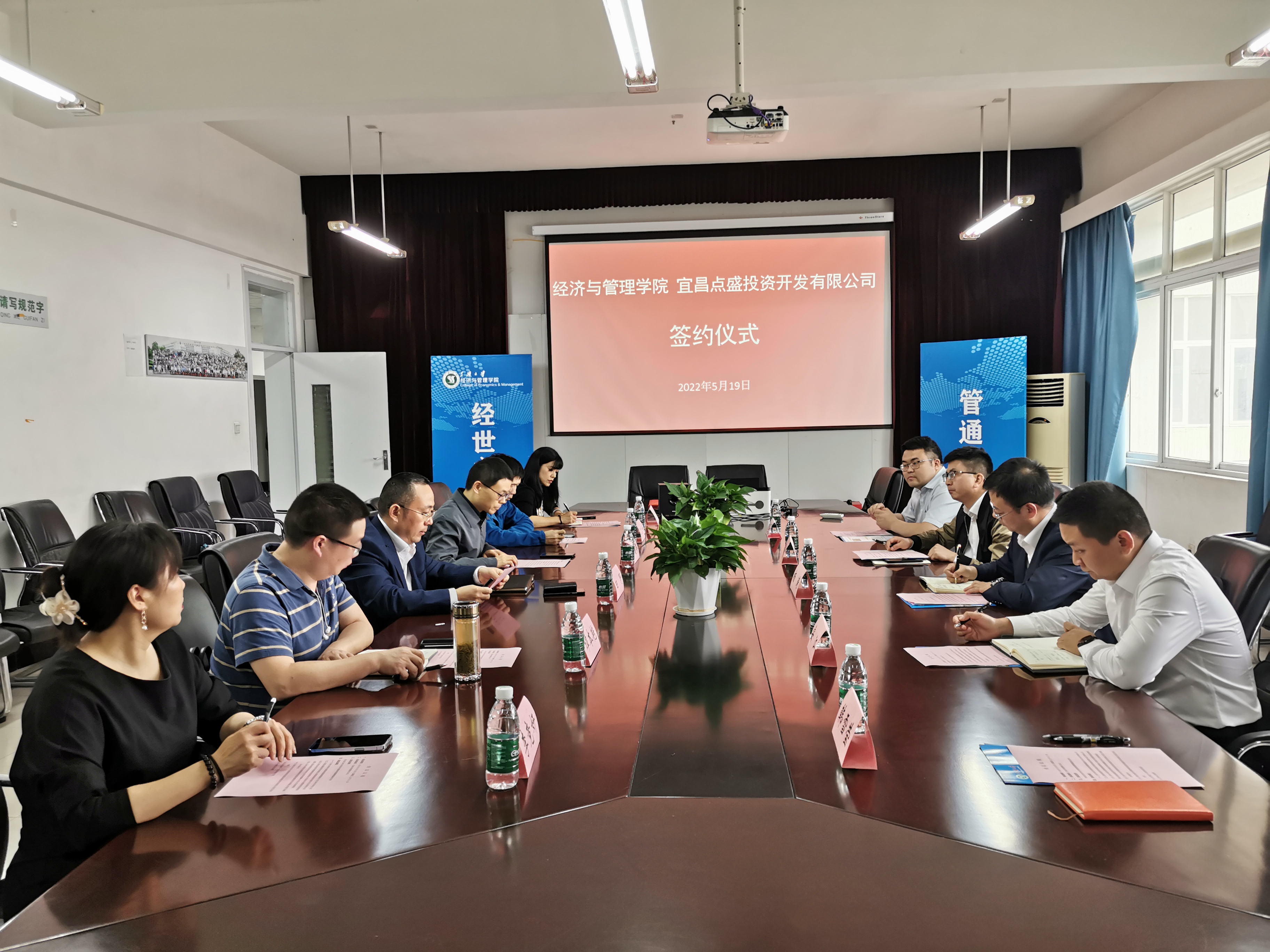 楊濤、覃朝暉代表雙方簽訂了《宜昌點(diǎn)盛投資開發(fā)有限公司與三峽大學(xué)經(jīng)濟(jì)與管理學(xué)院戰(zhàn)略合作意向書》。