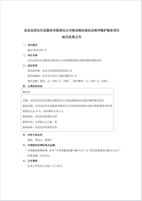 宜昌宜居樂(lè)生活服務(wù)有限責(zé)任公司商業(yè)物業(yè)保潔及秩序維護(hù)服務(wù)項(xiàng)目成交結(jié)果公告