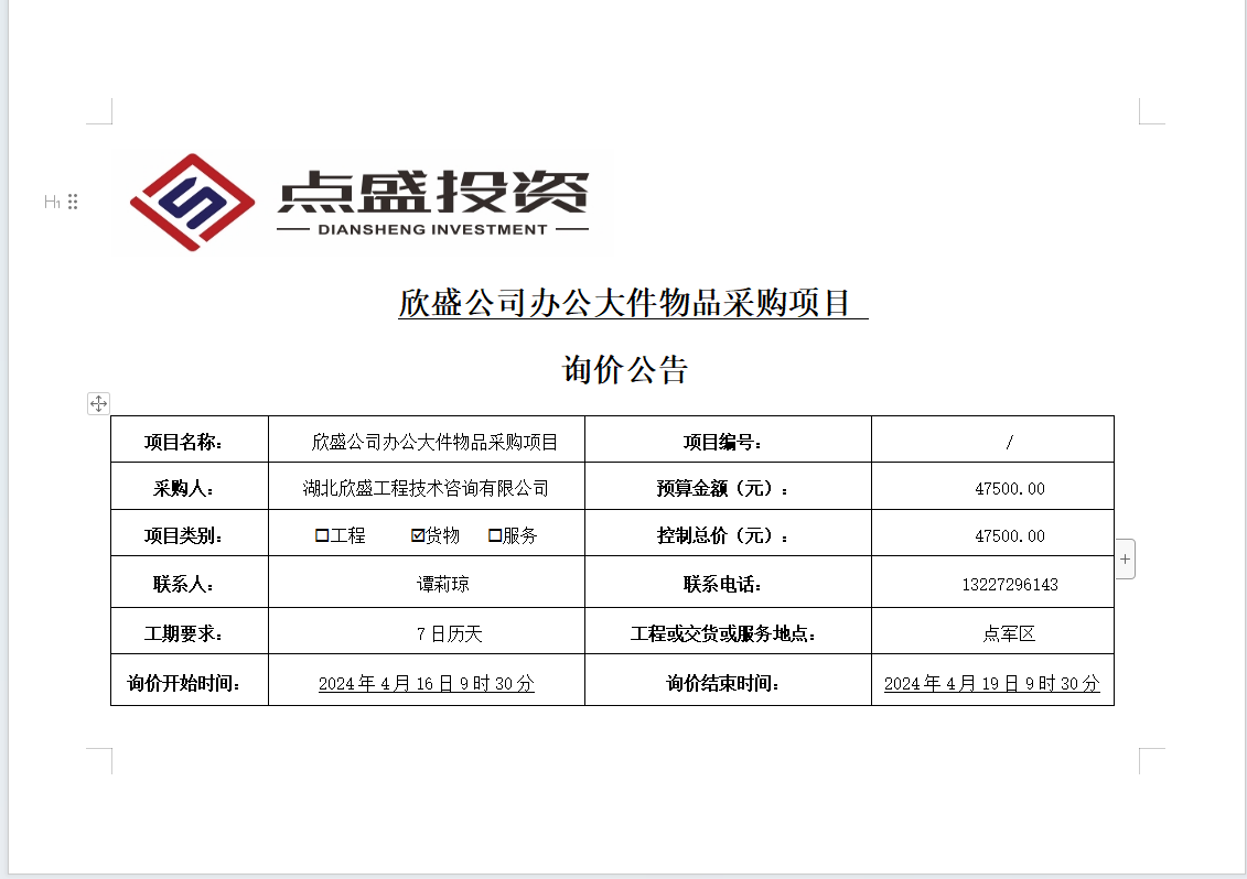 欣盛公司辦公大件物品采購項(xiàng)目詢價(jià)公告