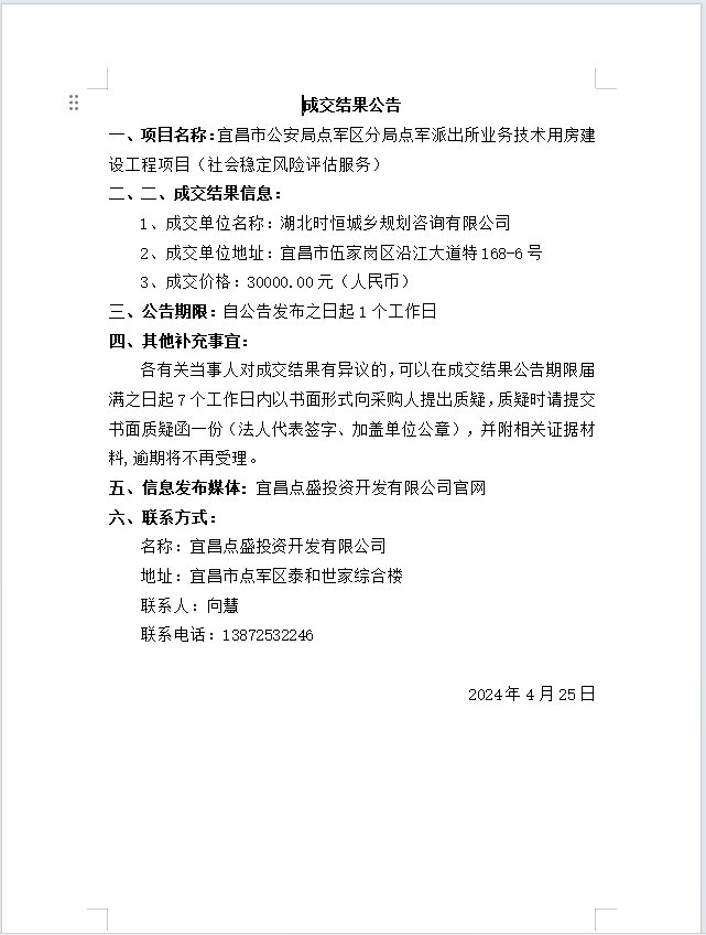 宜昌市公安局點軍區(qū)分局點軍派出所業(yè)務(wù)技術(shù)用房建設(shè)工程項目(社會穩(wěn)定風(fēng)險評估服務(wù))成交公告