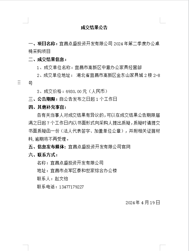 宜昌點盛投資開發(fā)有限公司2024年第二季度辦公桌椅采購項目成交公告