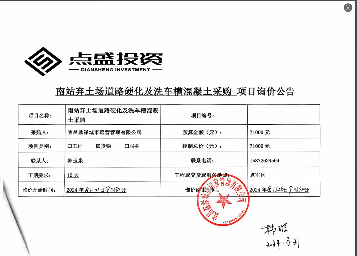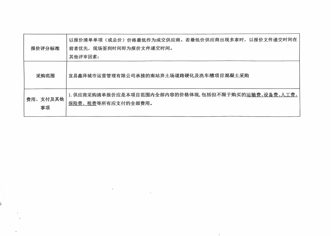 宜昌鑫澤城市運(yùn)營(yíng)管理有限公司南站棄土場(chǎng)道路硬化及洗車(chē)槽混凝土采購(gòu)項(xiàng)目詢價(jià)公告