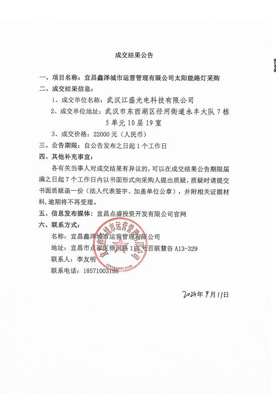 宜昌鑫澤城市運(yùn)營管理有限公司太陽能路燈采購項(xiàng)目成交公告
