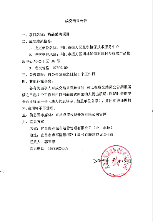 宜昌鑫澤城市運(yùn)營管理有限公司藥品采購項(xiàng)目成交公告