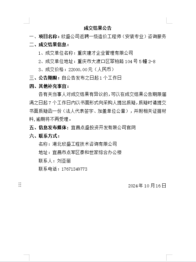 欣盛公司返聘一級造價工程師(安裝專業(yè))咨詢服務成交公告