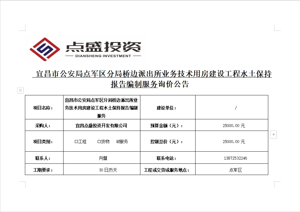宜昌市公安局點(diǎn)軍區(qū)分局橋邊派出所業(yè)務(wù)技術(shù)用房建設(shè)工程水土保持報(bào)告編制服務(wù)詢價(jià)公告