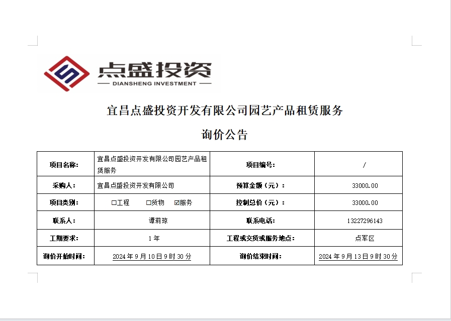 宜昌點盛投資開發(fā)有限公司園藝產(chǎn)品租賃服務(wù)詢價公告