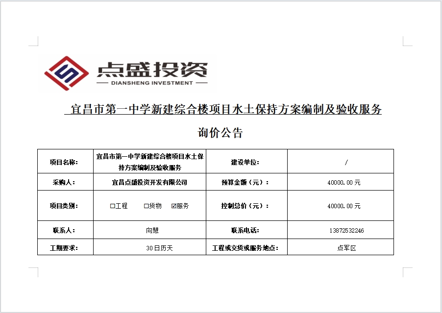 宜昌市第一中學(xué)新建綜合樓項(xiàng)目水土保持方案編制及驗(yàn)收服務(wù)詢價公告