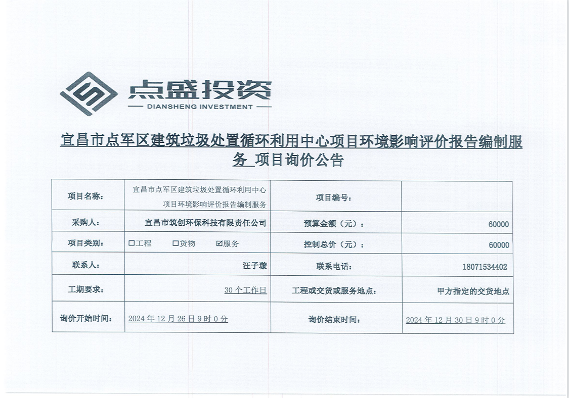 宜昌市點(diǎn)軍區(qū)建筑垃圾處置循環(huán)利用中心項(xiàng)目環(huán)境影響評價(jià)報(bào)告編制服務(wù)項(xiàng)目詢價(jià)公告